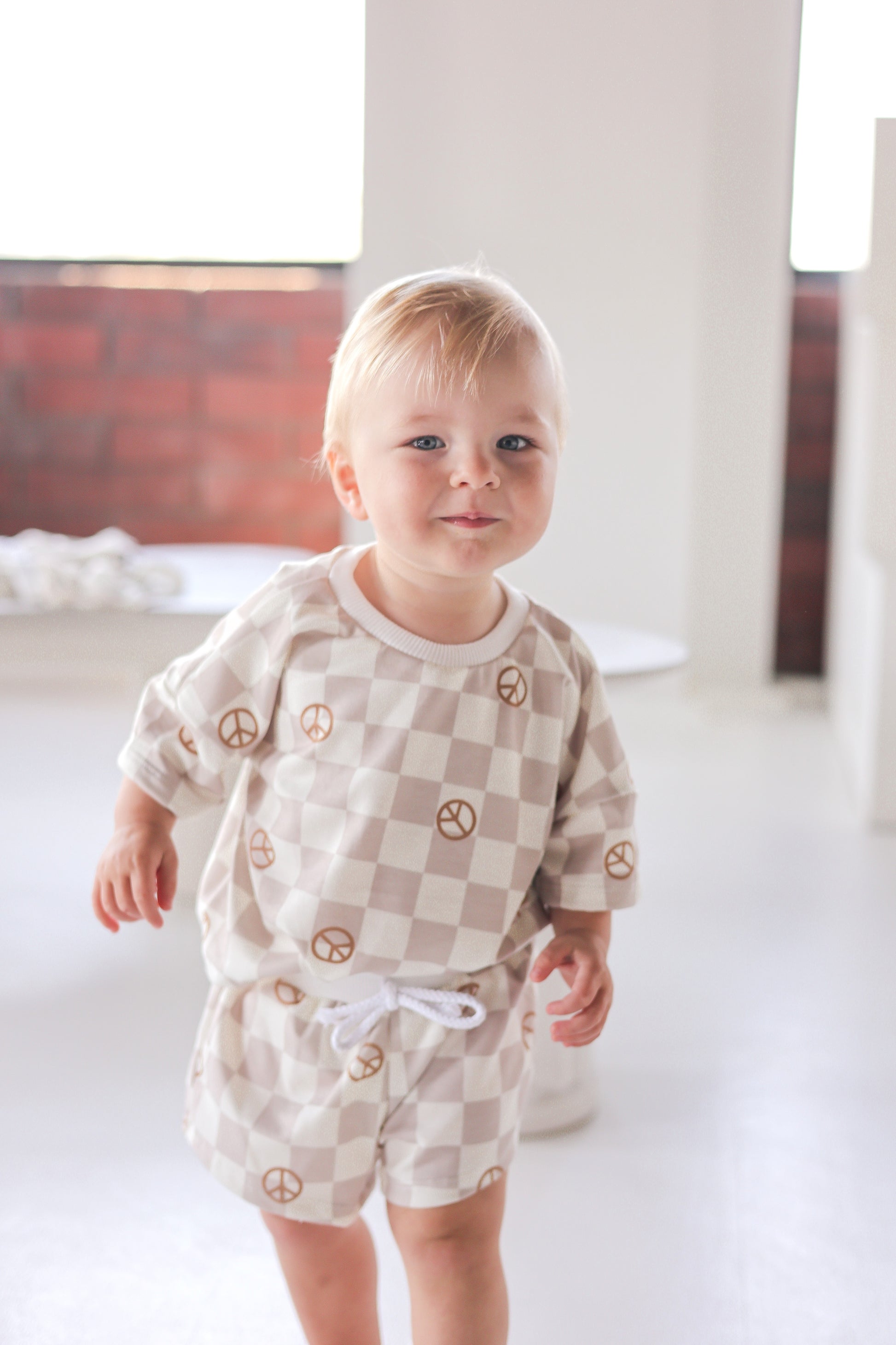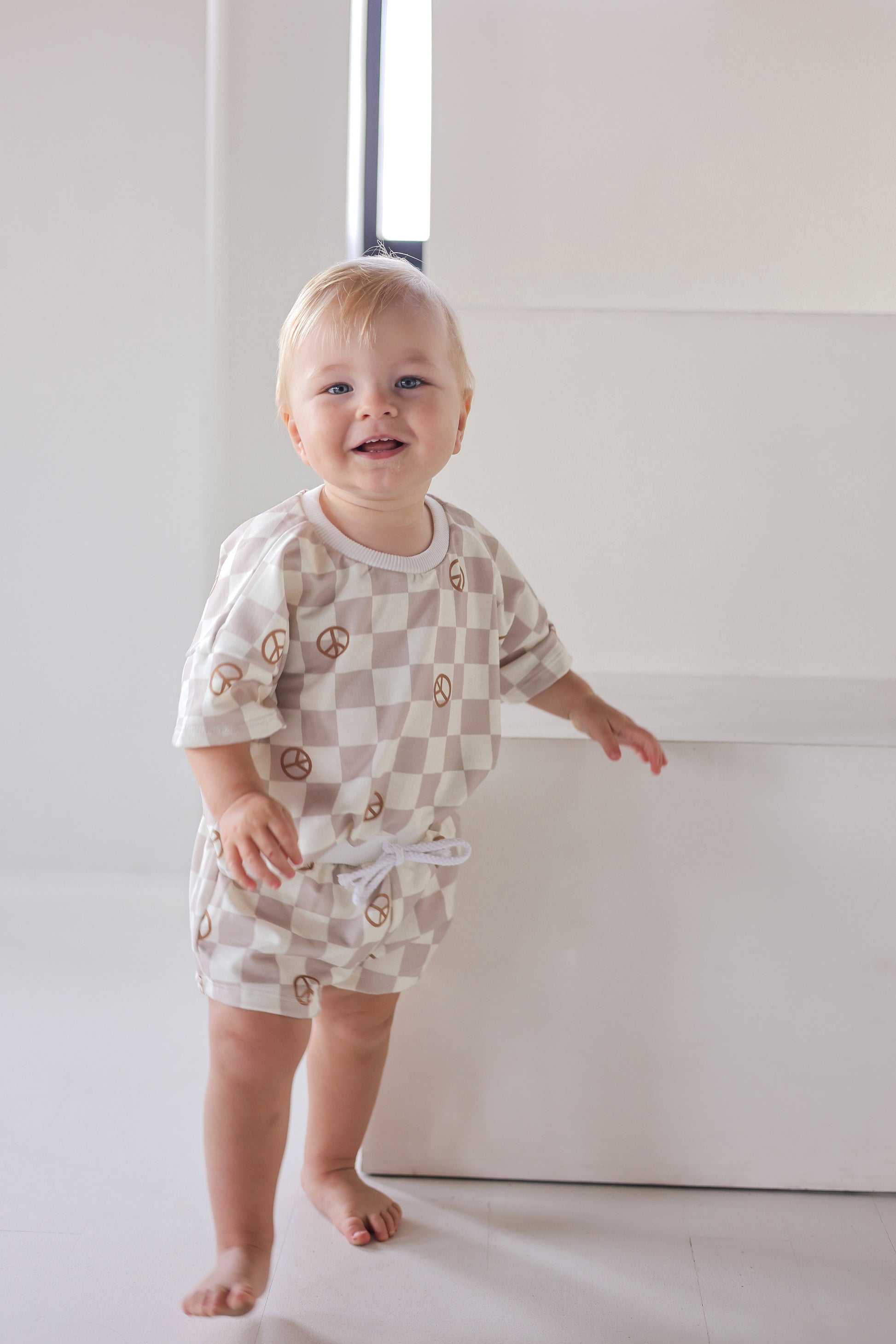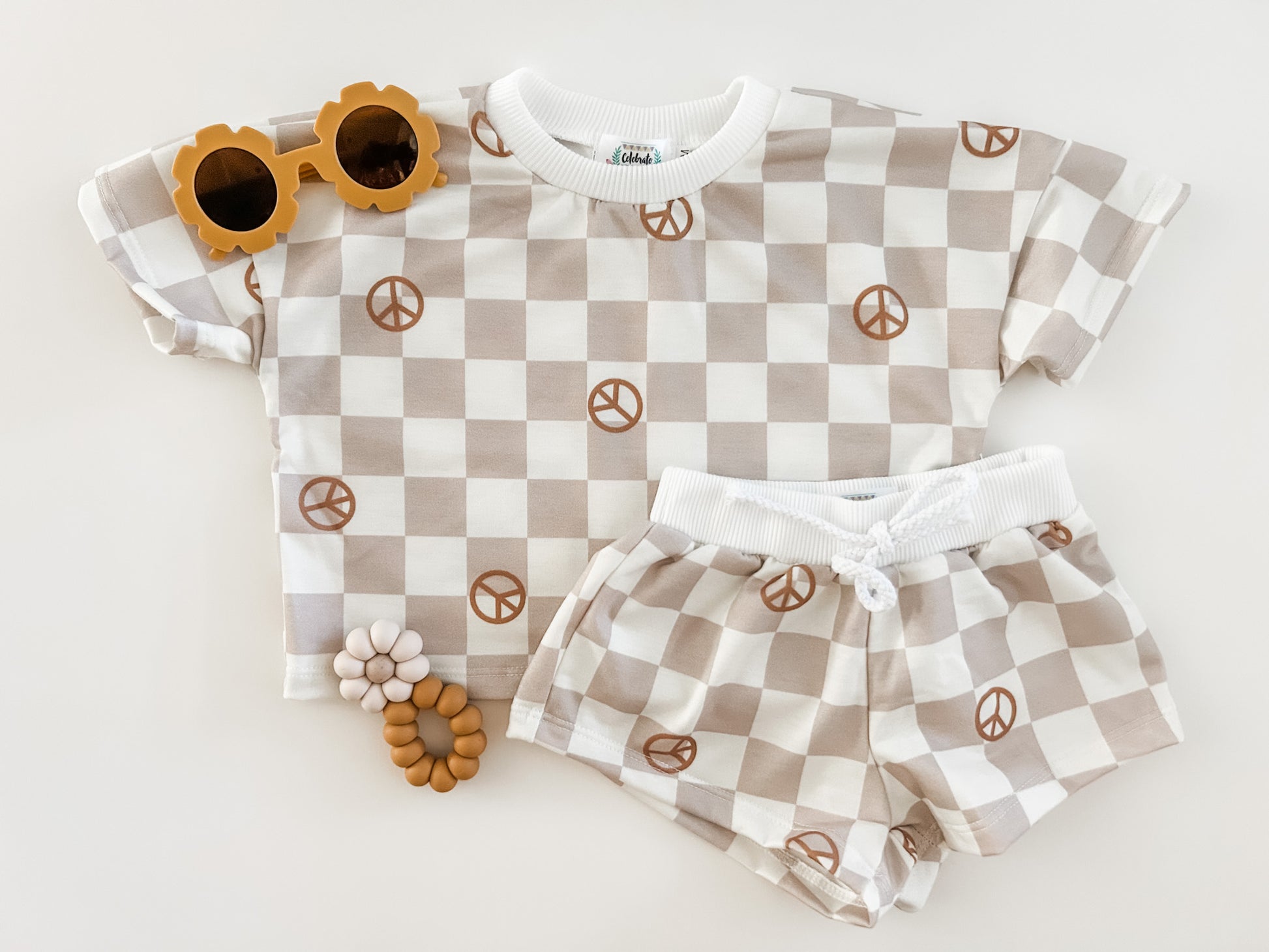 Spread those good vibes in the adorable Peace Out Short set, featuring a playful checkboard pattern that is neutral for unisex wear. Perfect for everyday play, ultra durable and cozy as can be.