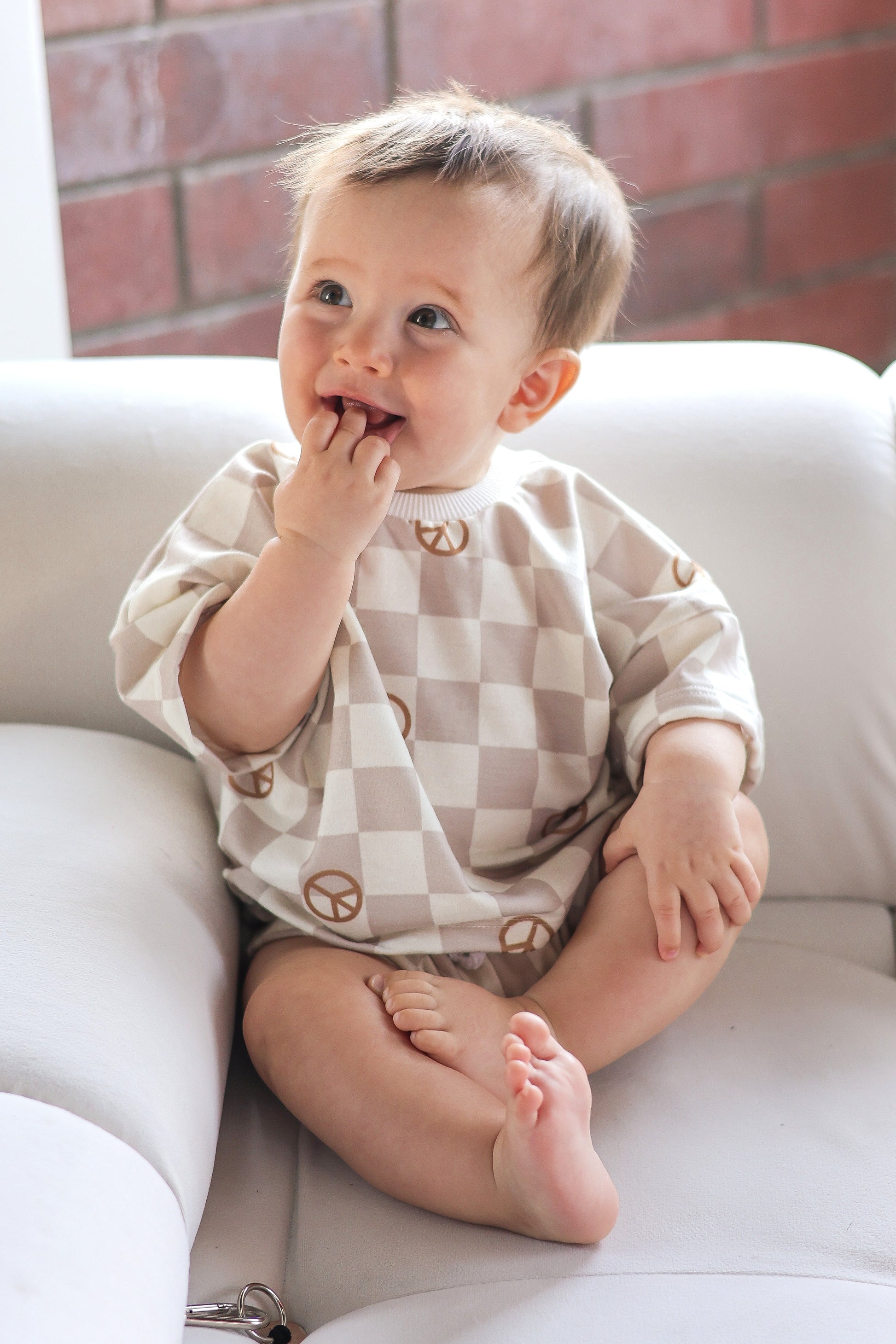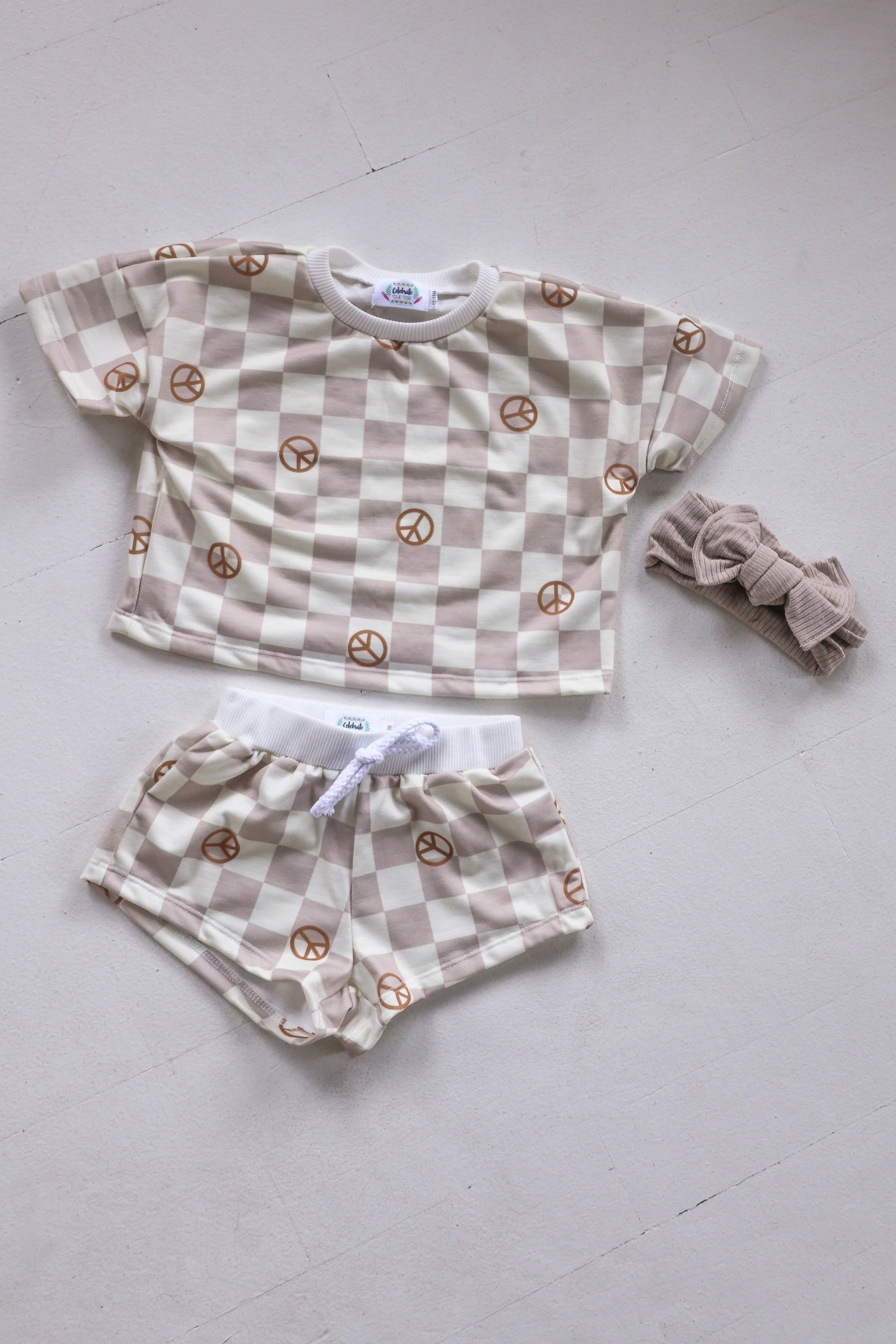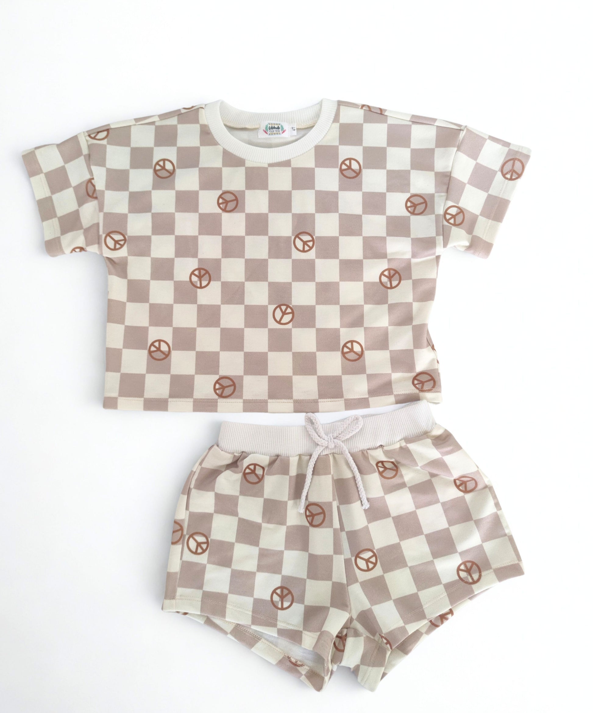 Spread those good vibes in the adorable Peace Out Short set, featuring a playful checkboard pattern that is neutral for unisex wear. Perfect for everyday play, ultra durable and cozy as can be.