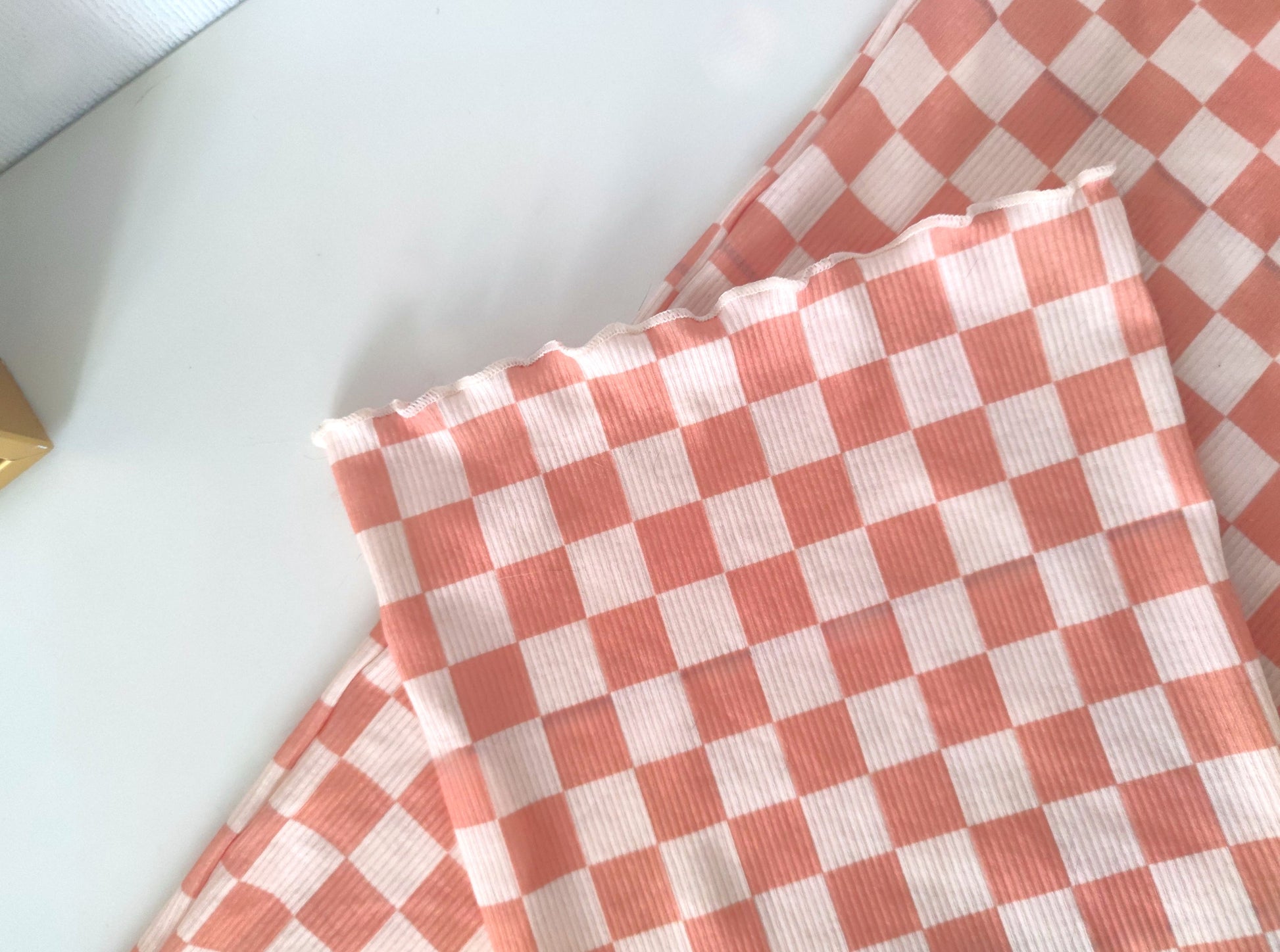 Cutest wide-legged pants for the little trend setter. Print featured an all-over soft orange and off-white checkerboard print with a stretch waist and decorative tie.