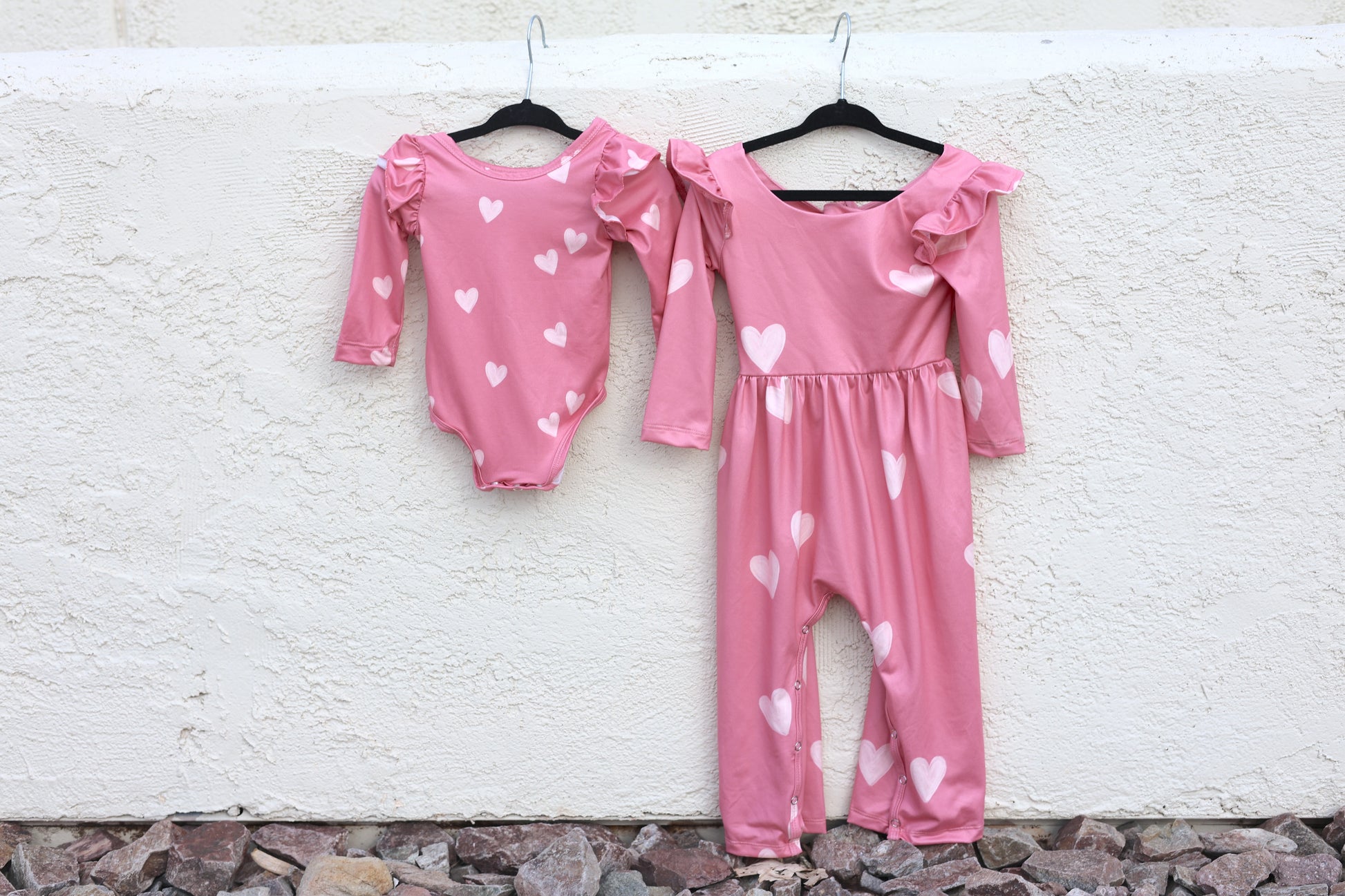Perfect for your little sweetheart, this jumpsuit combines style with all-day comfort. Featuring delicate ruffle detailing at the shoulders and cozy long sleeves, it's perfect for keeping her warm while looking absolutely adorable. Mix and match with off-white leggings, a twirly tutu, or classic denim to create the perfect outfit. Bonus: coordinate with the matching Sweetheart Jumpsuit for a cute sibling look across sizes 18-24 months to Youth Small.