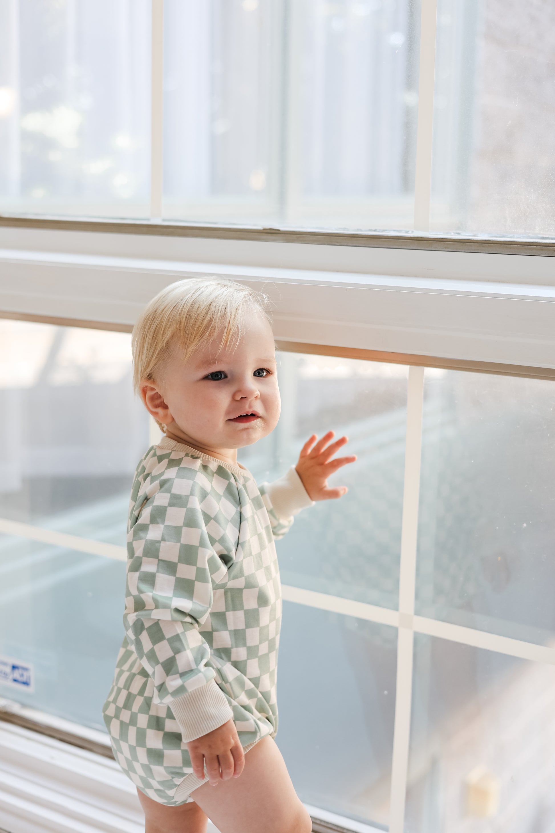 Adorable romper with a twist to the classic checkerboard pattern. Crafted from a soft cotton blend, it is light weight but sure to keep them warm with the long sleeves.