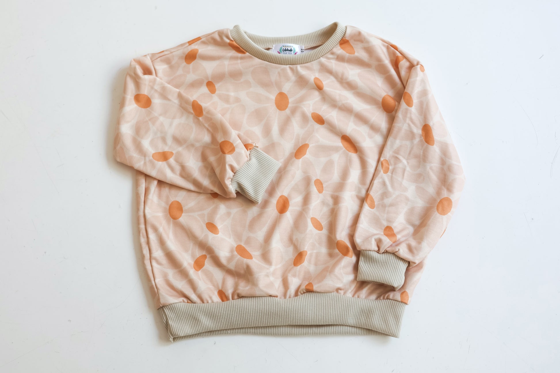 Cute and cozy, this pullover features a fun retro wavy petal pattern in peach and beige. Make it a matching moment with the matching girl's romper!
